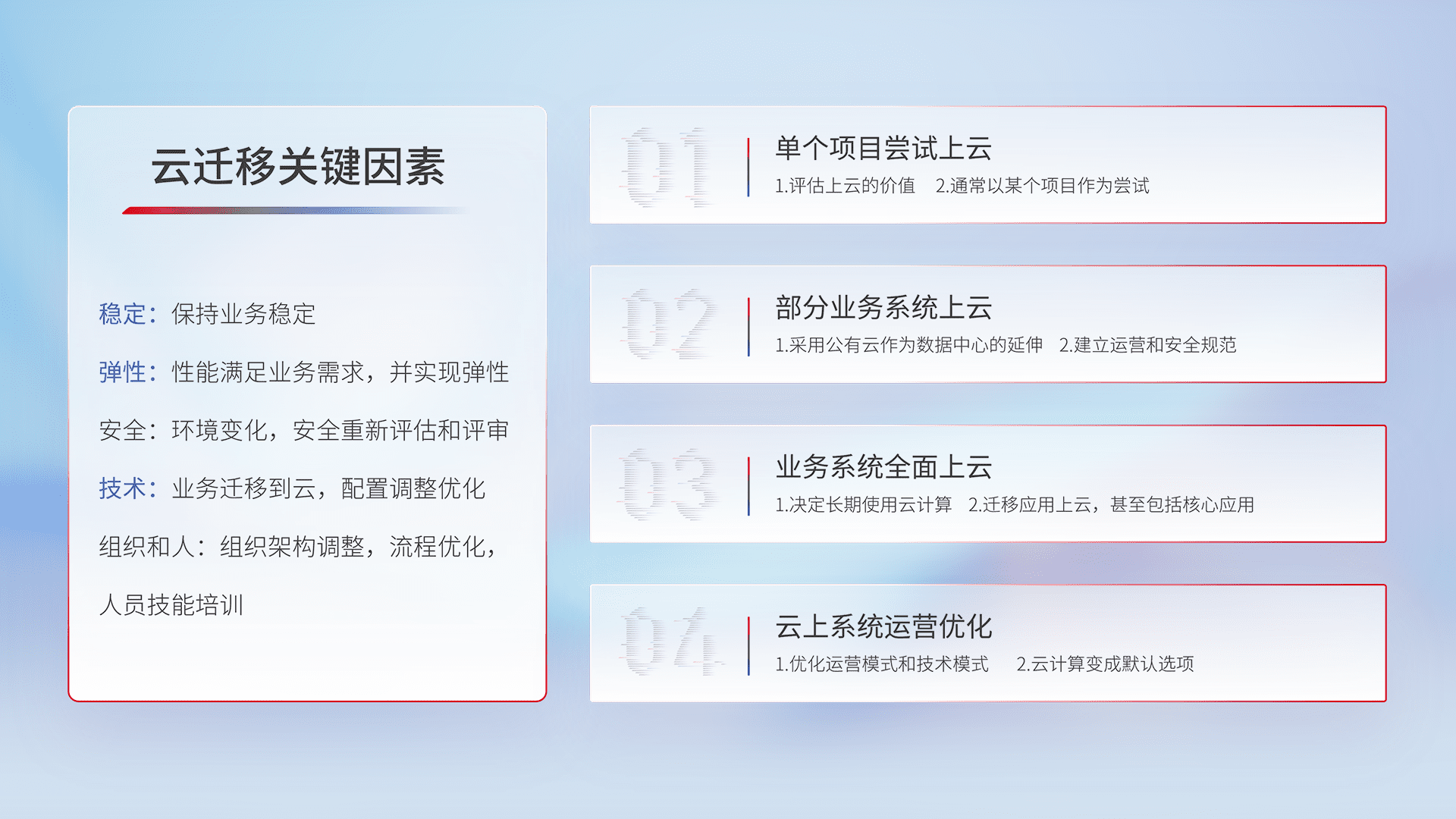 结合实际业务,,从规划设计、、、、云平台选型、、云原生改造、、、数据迁移、、、集成交付,,迁移全过程为客户识别最佳上云路径,,,,做好风险识别管理,,设计网络架构、、、、身份权限、、、安全审计合规、、、操作审计、、、日志审计、、、、监控告警策略、、多站点容灾设计等,,对云上基础设施进行整体规划,,,提升IT治理水平,,,以满足弹性、、高可用、、高性能的需求。。。。