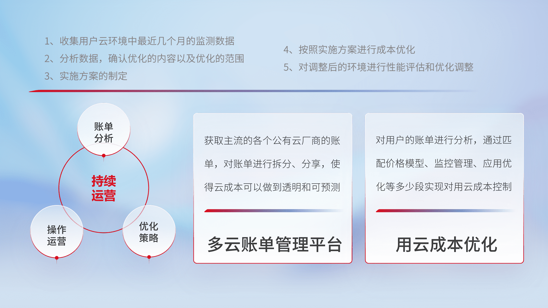 通过多云纳管,,以统一的资源数据模型把客户的云资源进行抽象和封装,,,,进而实现对多云资源的统一操作,,,保障云资源管理的可靠性、、、、稳定性与可用性。。。量身定制化运维内容,,,配置、、开发运维、、补丁管理、、、、备份、、、、监控、、认证和访问管理、、、审计和日常巡检等,,,,保障在用云过程中的可靠度,,,,稳定度以及高可用率。。。